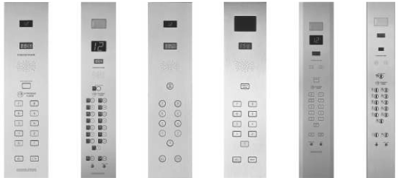 As botoeiras de cabina podem ser configuradas com diferentes acessórios, como luz de emergência, intercomunicador, chaves e botões para comando, gravações especiais, etc.